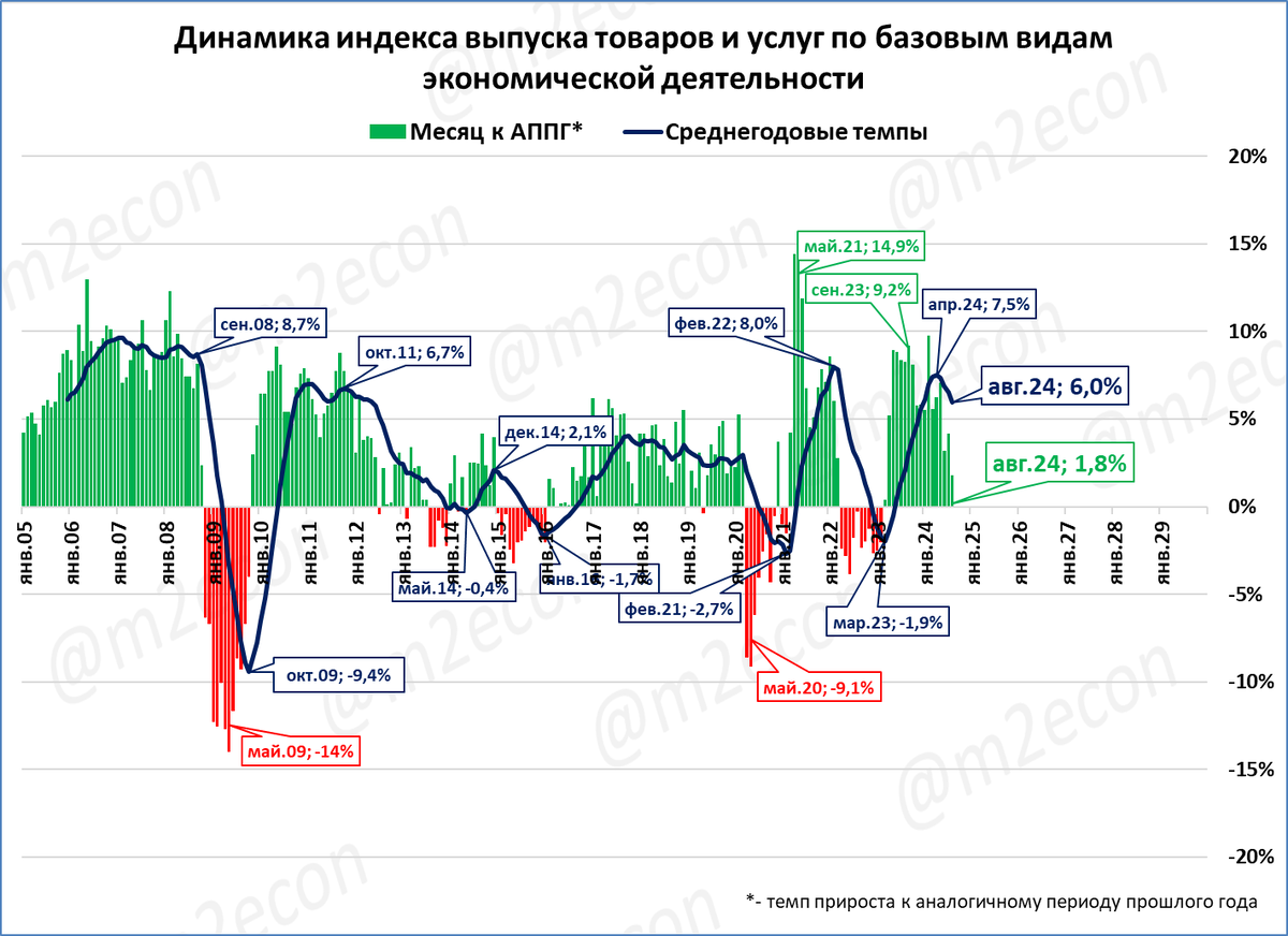 Текущие темпы ниже среднегодовых (зеленая линия ниже синей) и самые низкие с марта 2023 года, когда выпуск базовых отраслей вырос на 0,4% (то был первый рост после длительного падения).