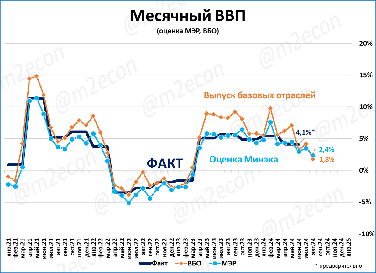 Но если оценки МЭР обычно ниже, чем динамика выпуска базовых отраслей (см. выше), то в августе всё наоборот.