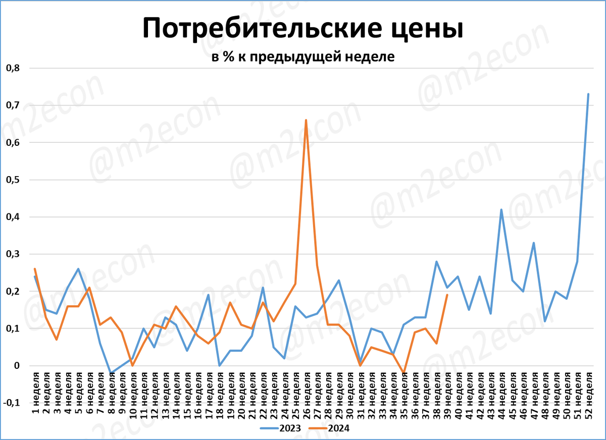 Недельная инфляция за 39 неделю стала максимальной с середины июля, но при это всё же ниже, чем на аналогичной неделе прошлого года.