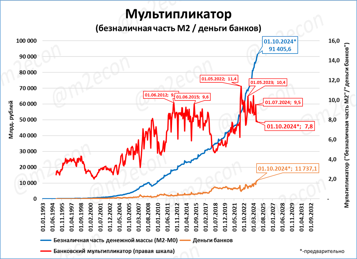 В марте 2024 года денежный мультипликатор установил исторический рекорд (4,04).