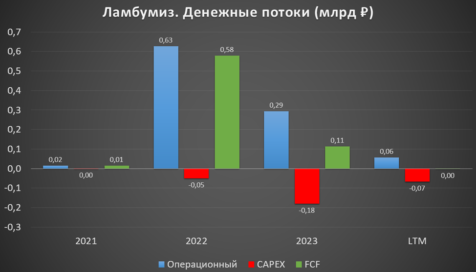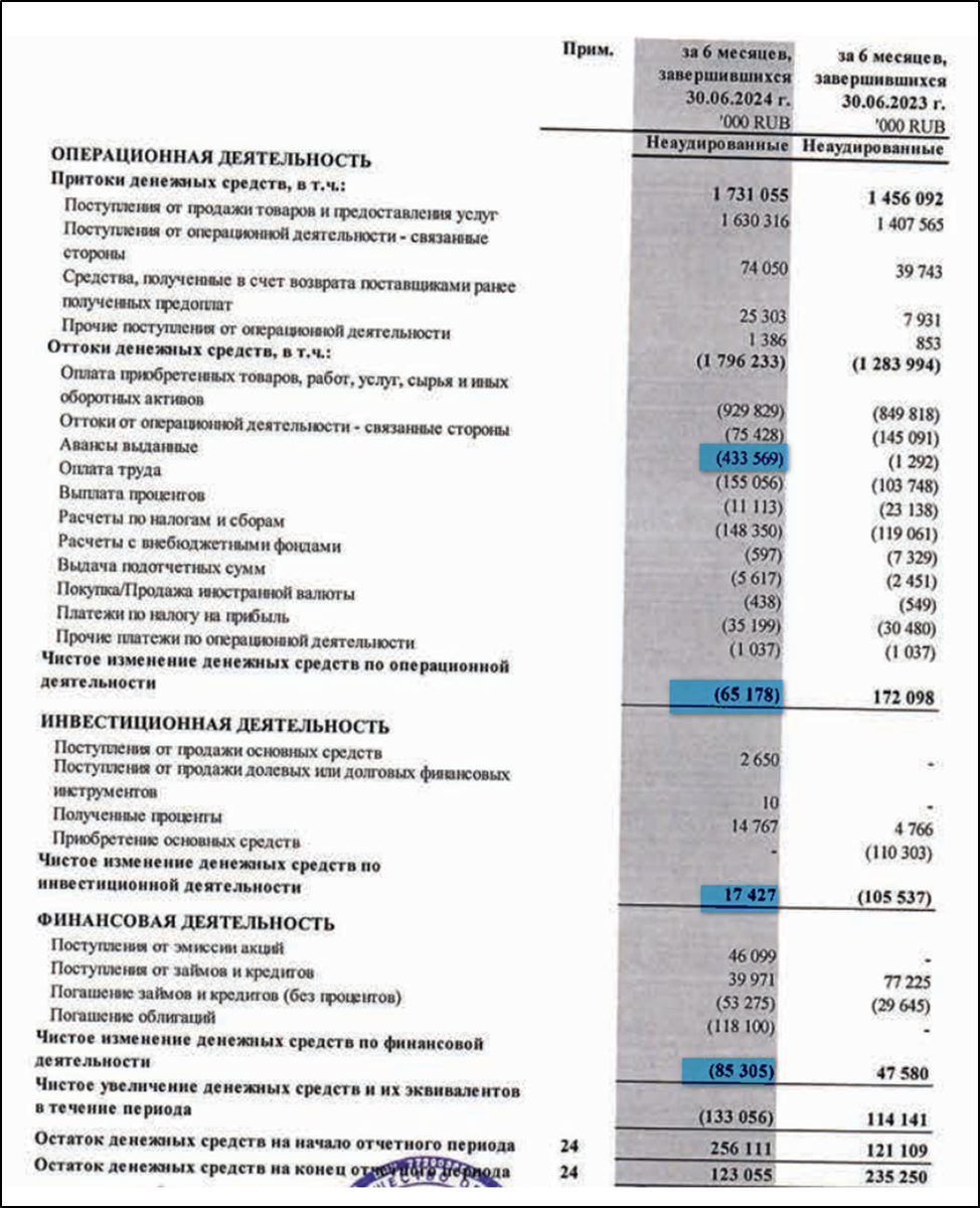 от операционной деятельности: -0,065 млрд. Отрицательное значение из-за высоких выплаченных авансов поставщикам.