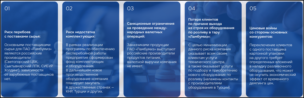 Конкуренция. Помимо Ламбумиз, крупнейшими игроками рынка неасептической упаковки в РФ являются: АО «ПраймКартонПак» (доля 25%), ООО «Молопак» (доля 20%), ООО «Роспак» (доля 10%) и ООО «Тралин ПАК» (доля 5%). А на рынке асептической упаковки в основном иностранные производители.