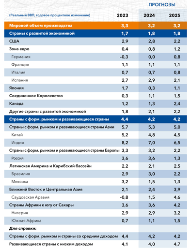 По прогнозу МВФ мировая экономика в 2024 и 2025 годах будет расти темпом +3,2% годовых.
