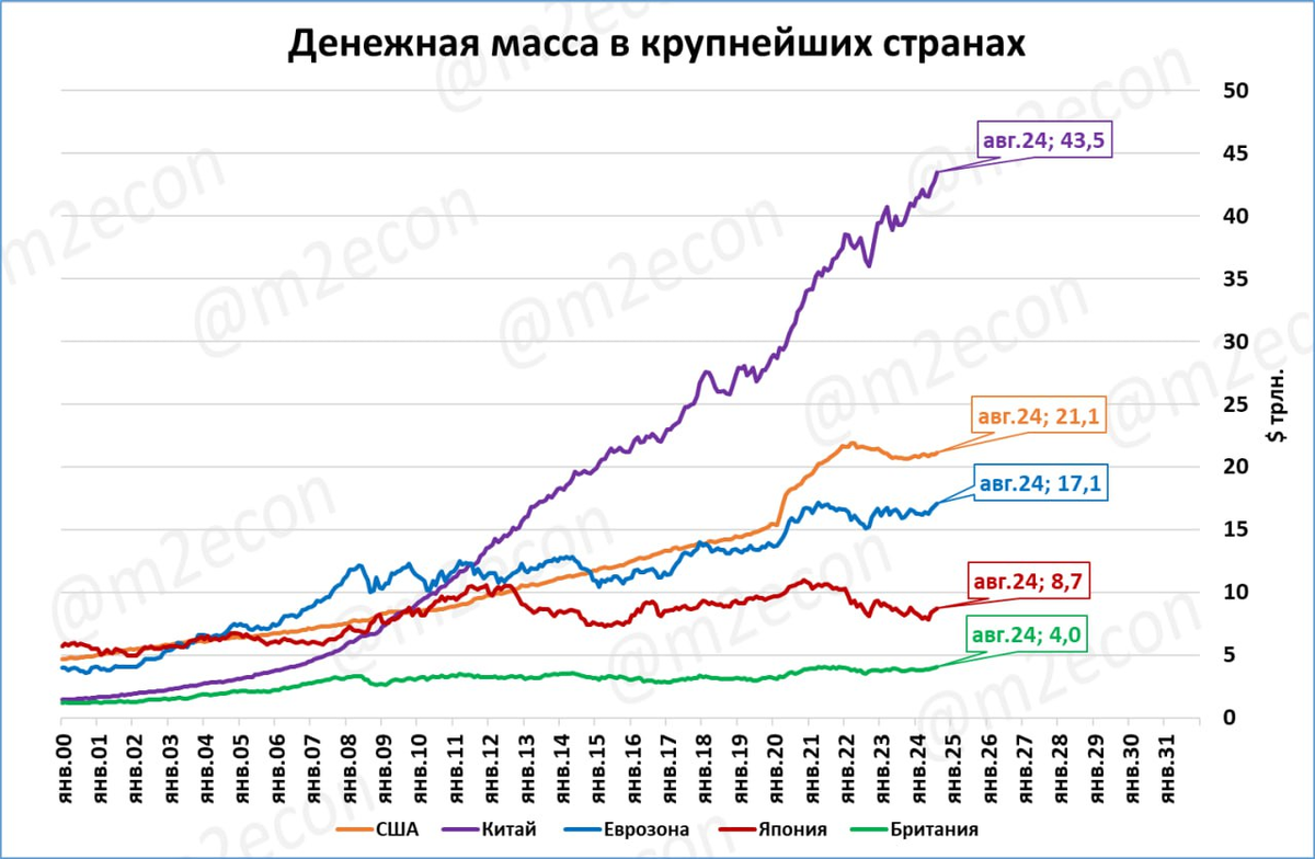 Как мы видим, по объёму денежной массы Китай лидирует с 2011 года.