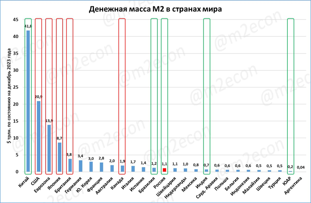По размеру своих денежных масс страны БРИКС (выделены зелёным) Бразилия, Россия, Индия и Южная Африка — карлики по сравнению со странами "Большой семёрки" (выделены красным).