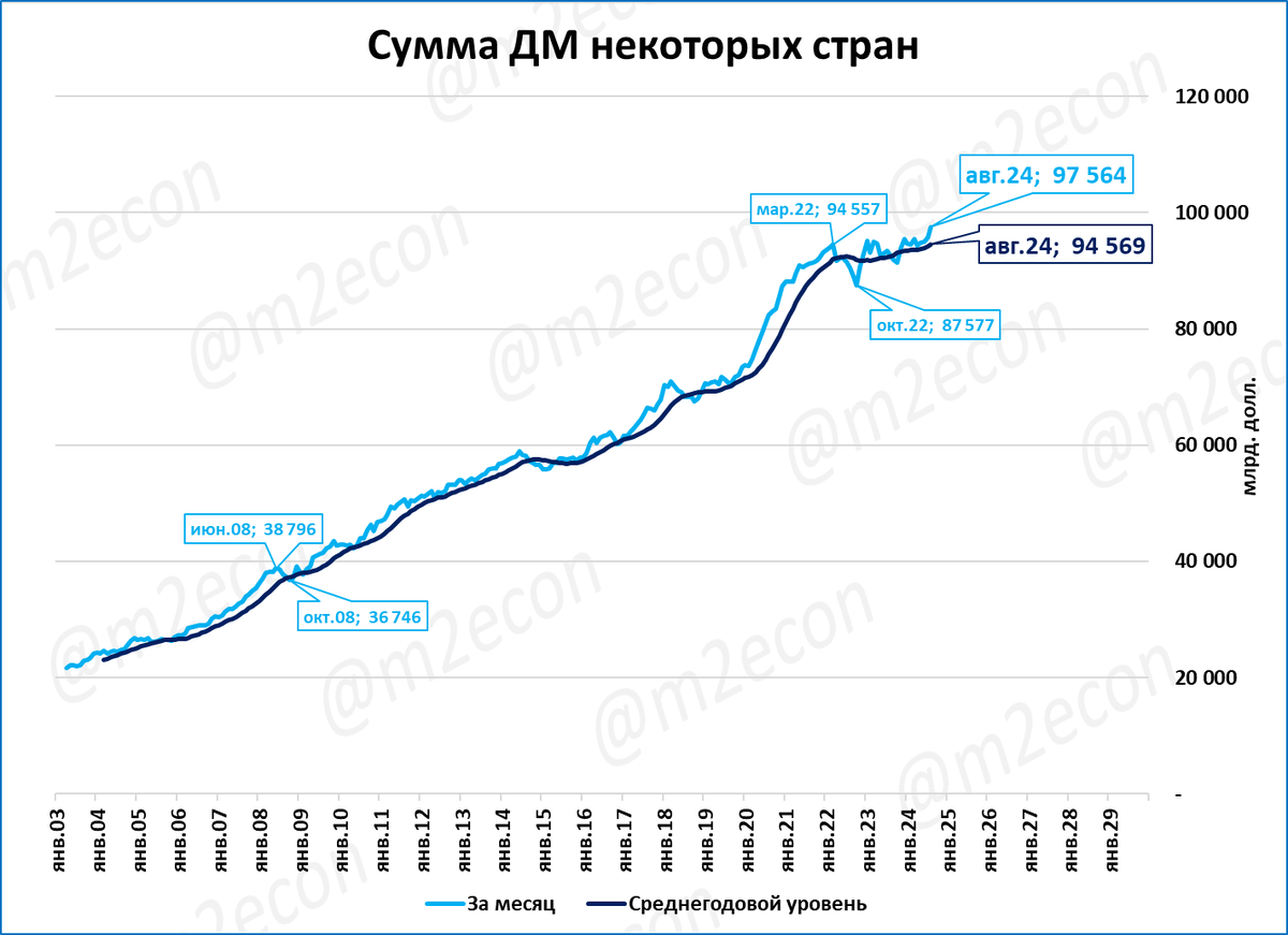 Максимальной мировая РДМ была в декабре 2021 года (99,3 трлн долларов), после чего снижалась. Затем она стабилизировалась на уровне около 93 трлн долларов.