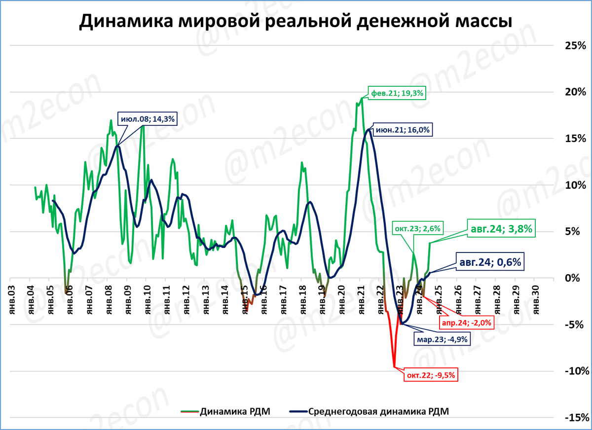 Мировая денежная масса в реальном выражении пока ниже, чем на пике в 2021 году. Но сейчас её рост возобновился.
