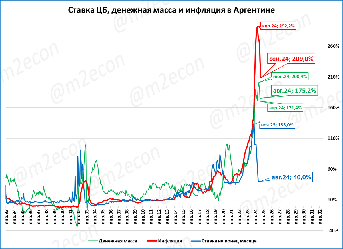В Аргентине инфляция по итогам сентября составила 209,0%. Реальная денежная масса сжимается. ВВП Аргентины в 1 квартале 2024 года упал на 5,1%.