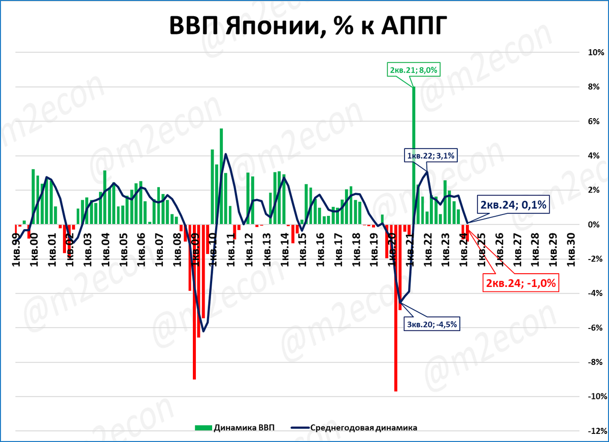 Падение ВВП в Японии во 2 квартале 2024 года составило 1,0%.