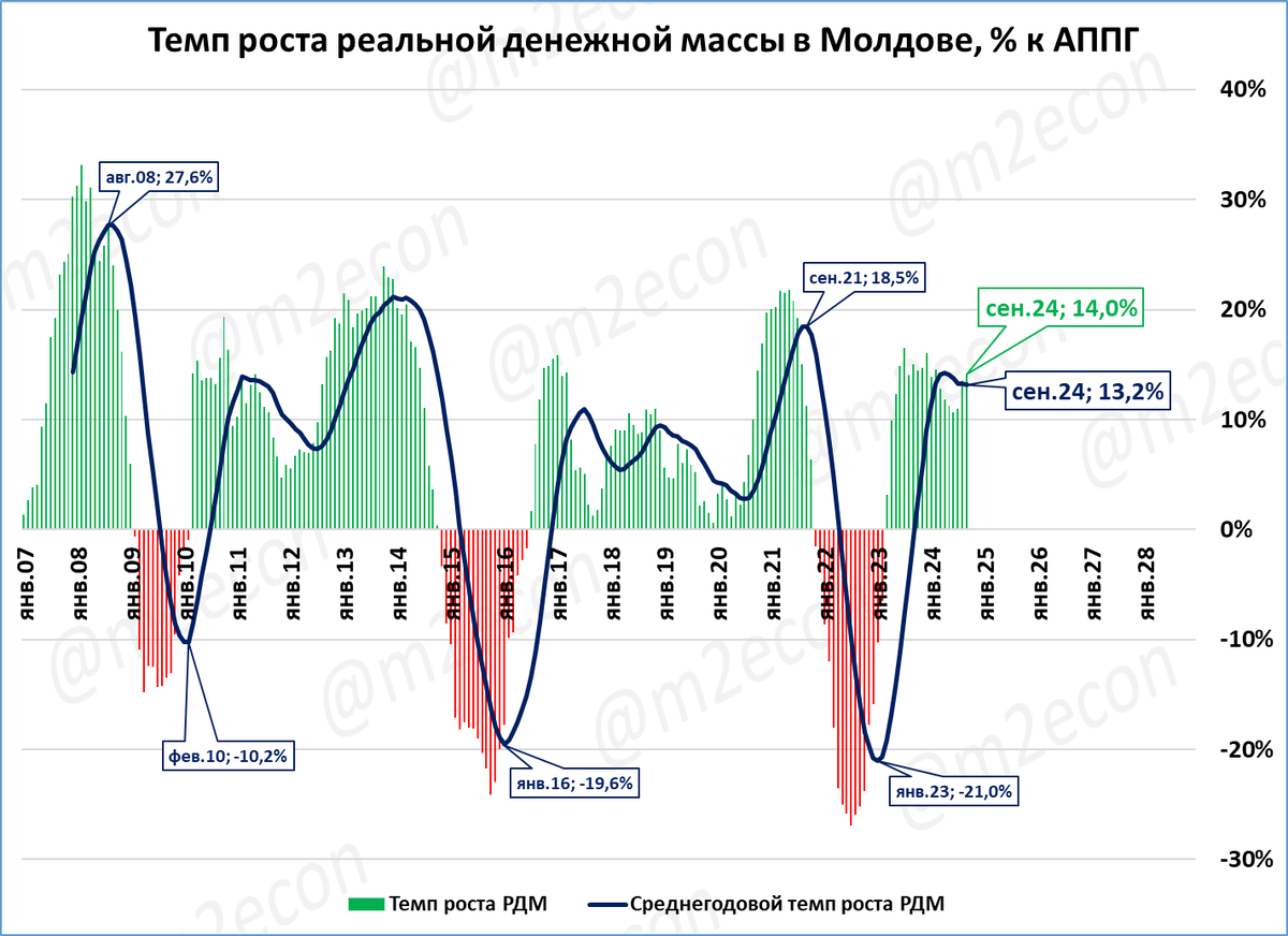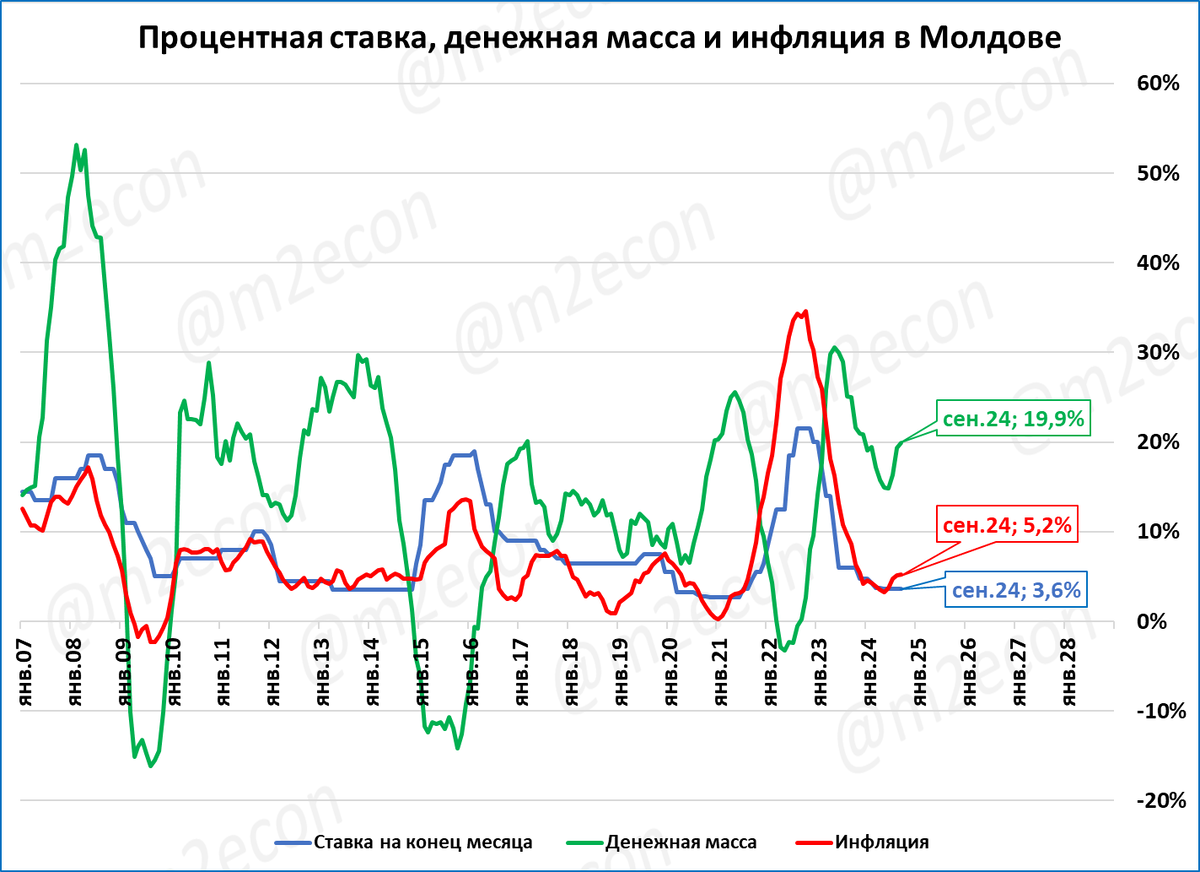 Молдова: инфляция по итогам сентября составила 5,2% годовых. Номинальные темпы роста денежной массы составили 20%. Реальная денежная масса растёт хорошими темпами. ВВП тоже растёт.