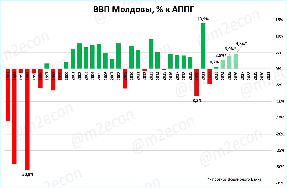 ВВП Молдовы по прогнозу ВБ (см. выше) вырастет в 2024 году на 2,8%.
