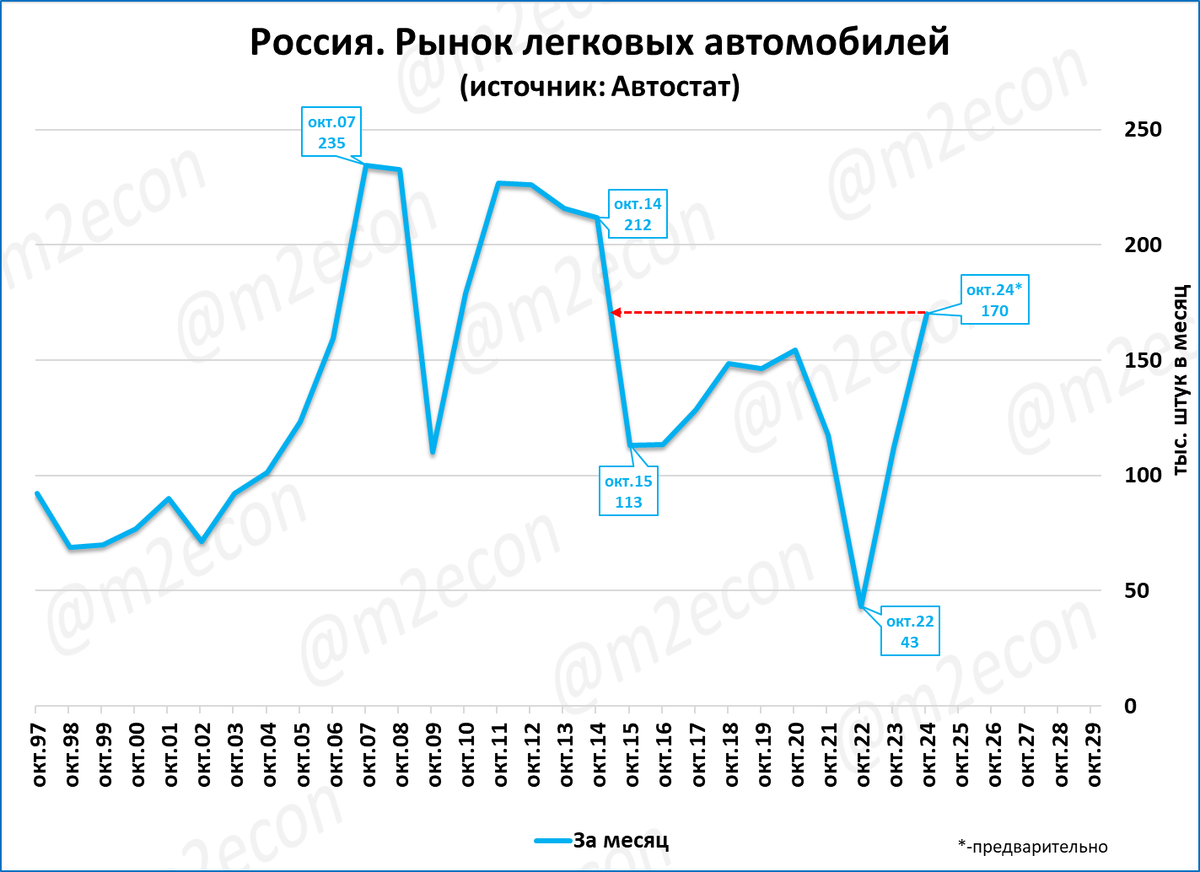 Судя по недельным данным, в октябре рынок легковых может составить 170 тысяч штук – это второй лучший месяц за последние 10 лет и лучшей среди октябрей. Оценка итогов 2024 года сохраняется на уровне 1,7 млн.