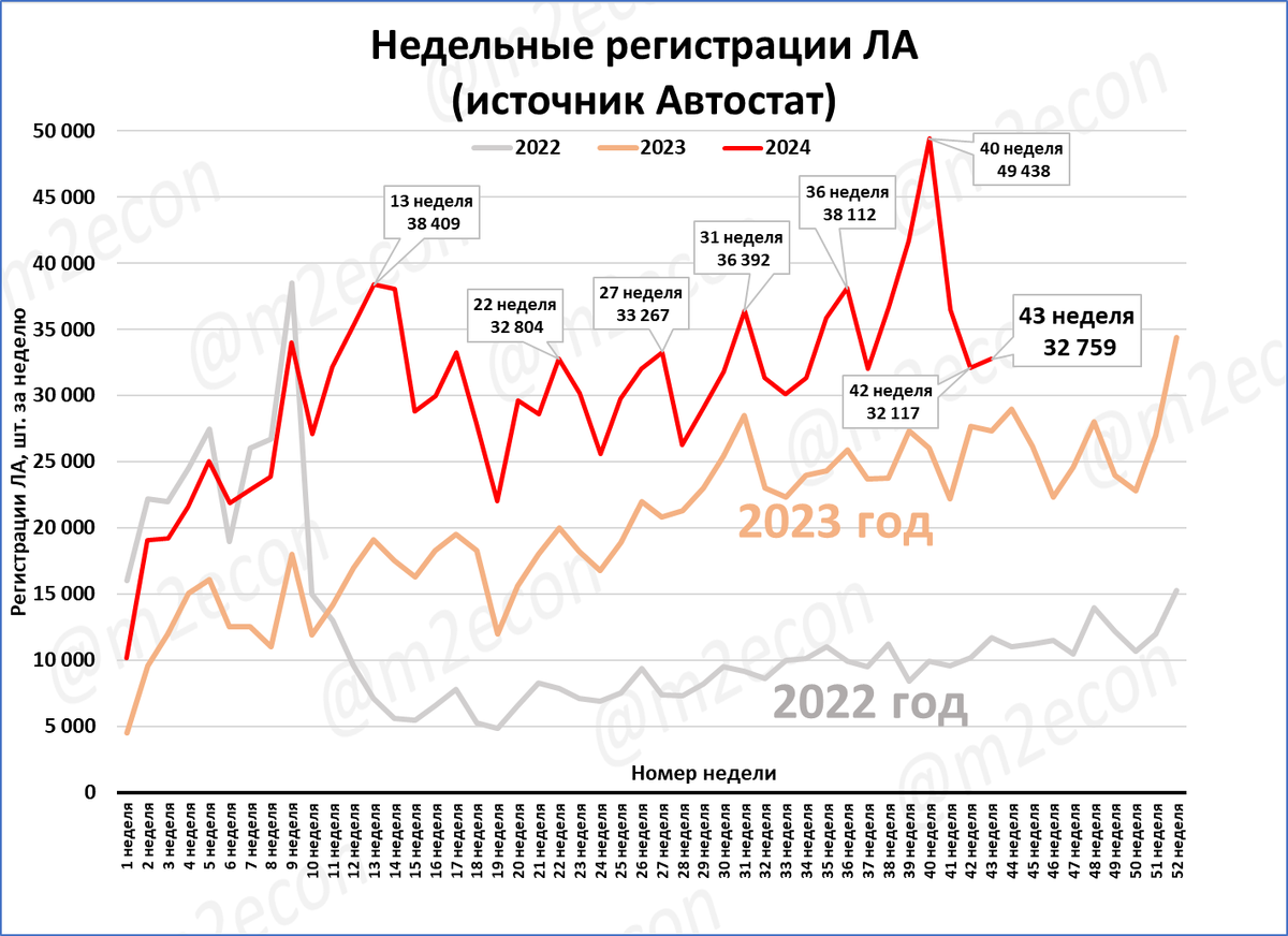 На 43-й неделе было зарегистрировано 32,8 тыс. легковых автомобилей (Автостат).
