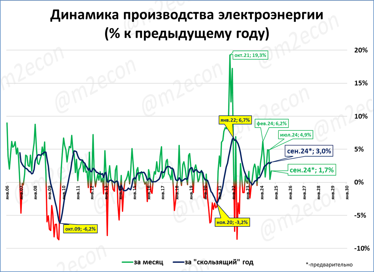 Производство электроэнергии в сентябре выросло на 1,7%. Несмотря на столь невысокий рост, объём производства за 12-месяцев (скользящий год) установил очередной исторический рекорд.