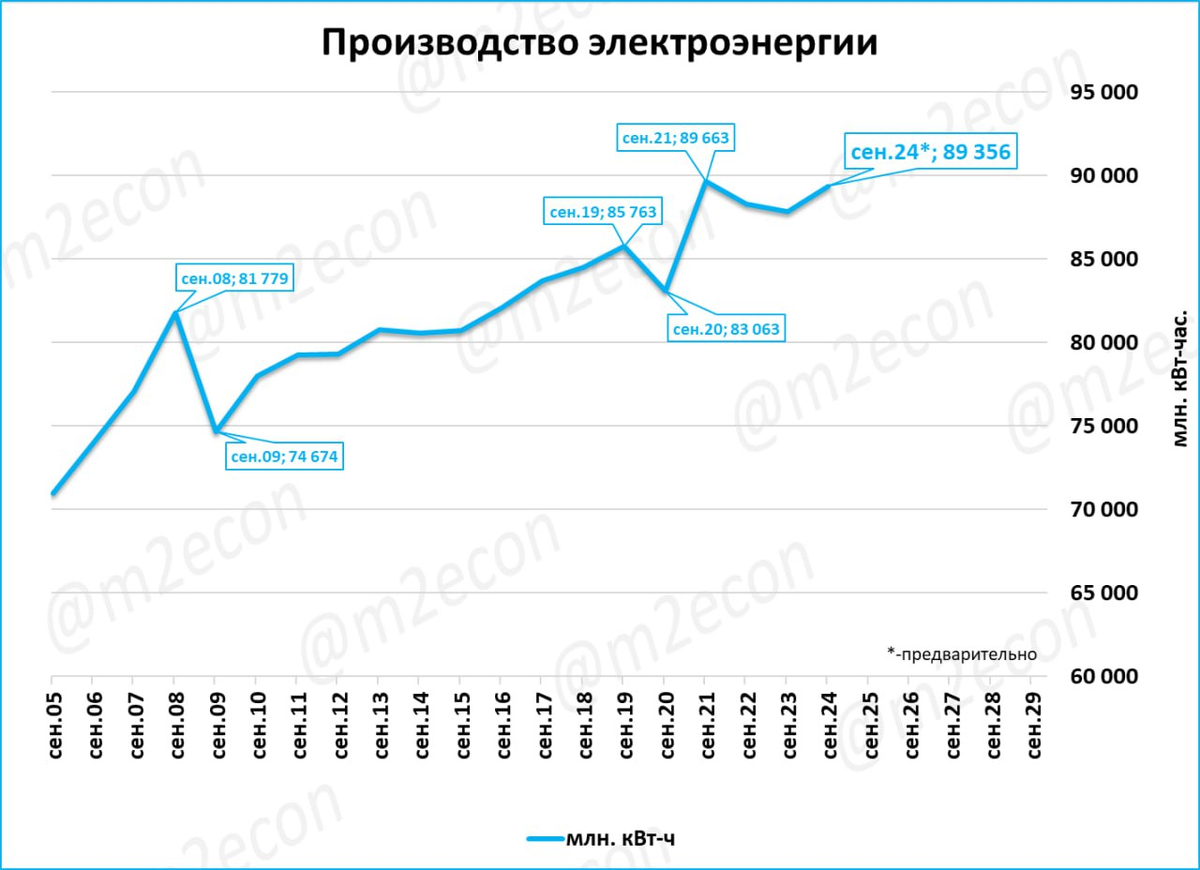 Производство электроэнергии в сентябре составило по нашим предварительным оценкам 89,4 млрд. квт-часов.