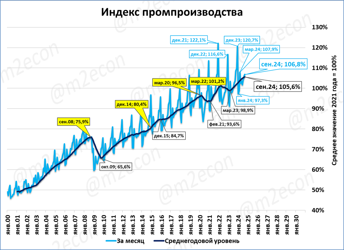 Промпроизводство за последние 12 месяцев (скользящий год) составило 106% к уровню 2021 года. Это очередной исторический рекорд.