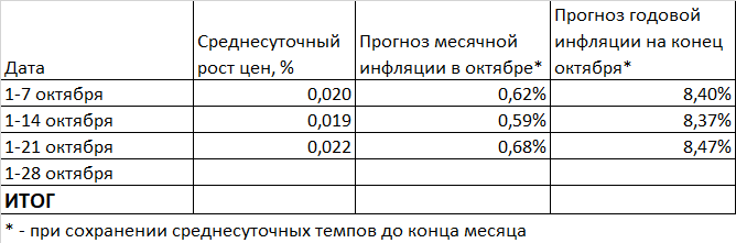 Среднесуточный рост цен с 1 по 21 октября составил 0,022%.