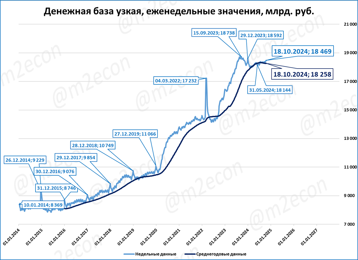 На 18 октября узкая денежная база (УДБ) составила 18,5 трлн рублей.