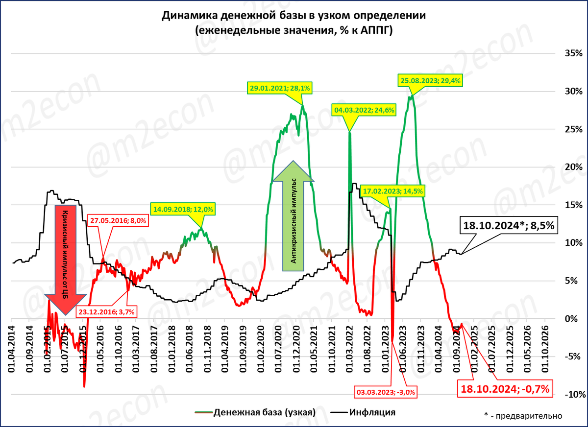 Узкая денежная база в реальном выражении падает, -7,6% годовых.