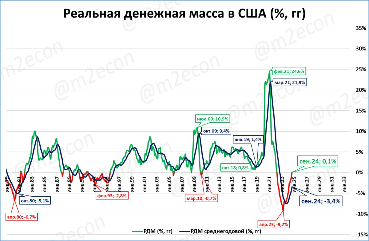 Это сжатие не нанесло существенного ущерба экономике США, так как происходило после беспрецедентного в новейшей истории расширения реальной денежной массы в 2020-2021 годах.