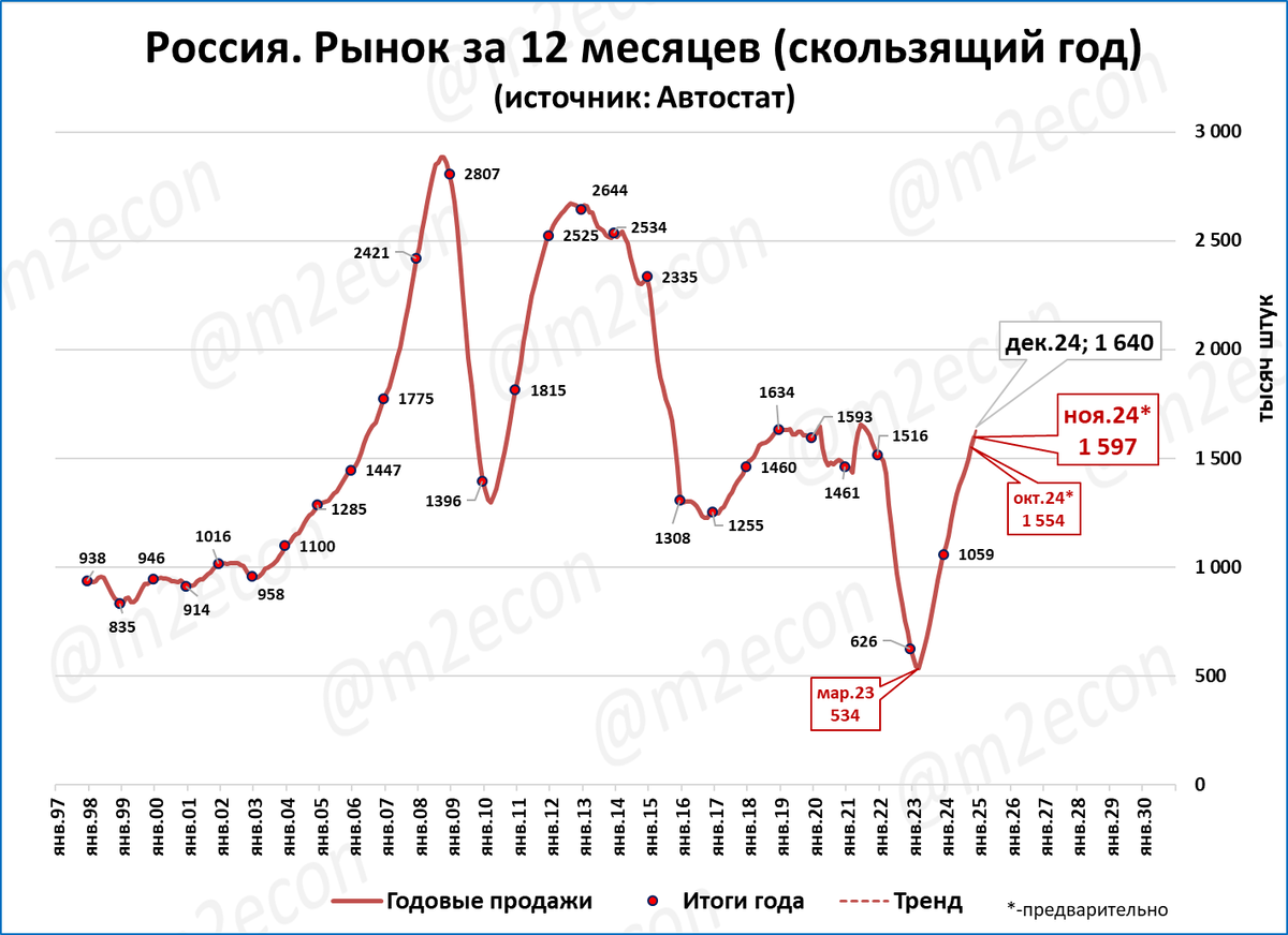 Продажи за 12 месяцев по итогам ноября приближаются в этом случае к 1,6 млн. штук.