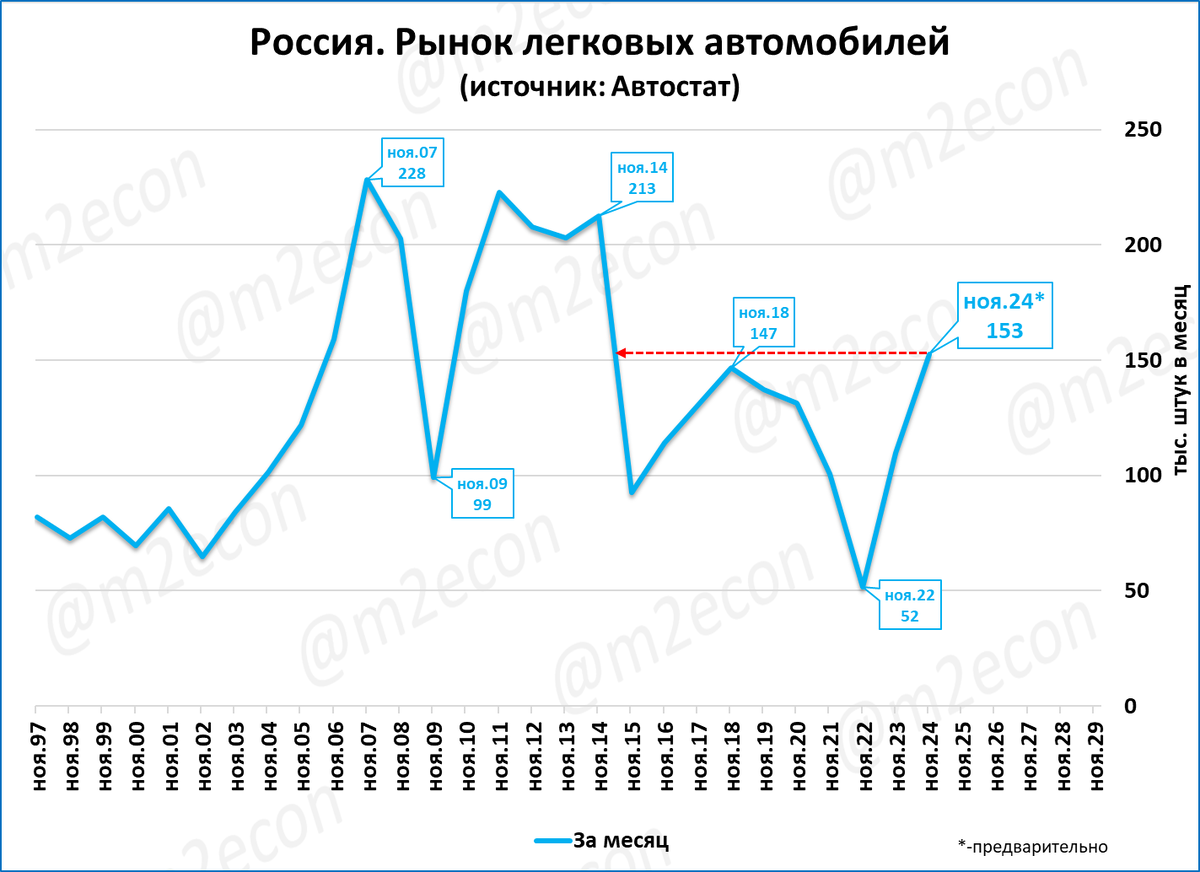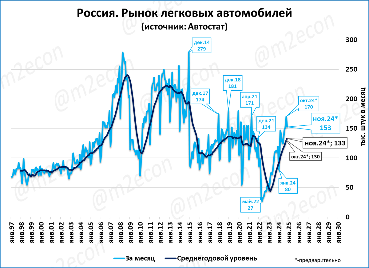 Судя по недельным данным, в ноябре рынок легковых может составить 153 тысяч штук – это лучший ноябрь за последние 10 лет. Оценка итогов 2024 года – рынок может достигнуть 1,64 млн. и стать лучшим за 10 лет.