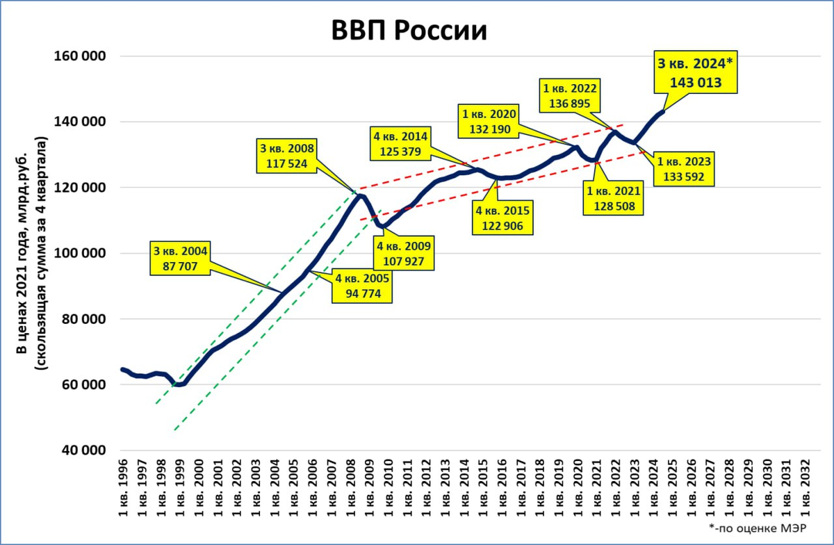 Так, за последние 4 квартала ВВП составил 143 трлн. рублей в ценах 2021 года.