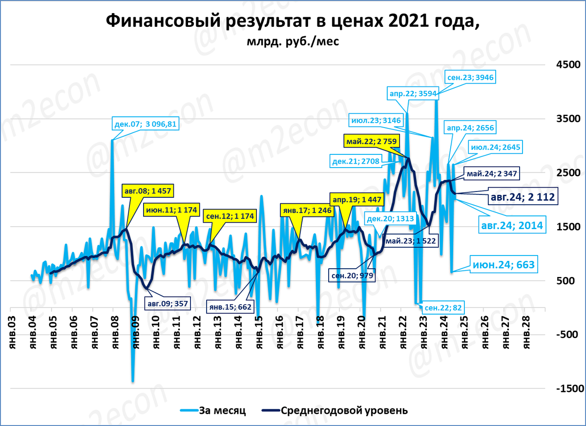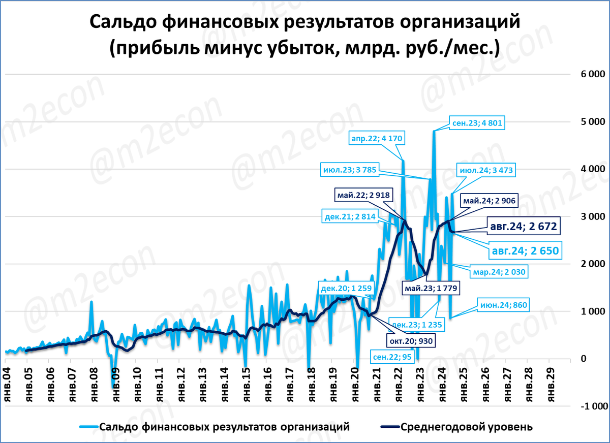 Прибыль предприятий в августе приросла на 2,65 трлн рублей. Прибыль за 12 месяцев (скользящий год) снижается с мая. Сейчас показатель стабилизируется на уровне около 25 трлн рублей (в ценах 2021 года). Сравнение: до 2021 года показатель ни разу не достигал даже 20 трлн.