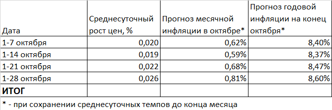 Если такой темп сохранится до конца месяца, то по итогам октября инфляция составит 8,60% годовых.