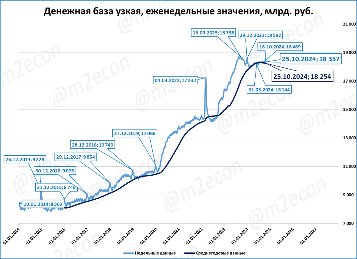 На 25 октября узкая денежная база (УДБ) составила 18,4 трлн рублей.