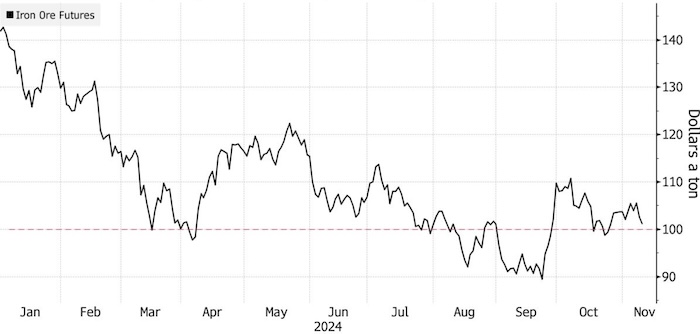 Цена на железную руду приблизилась к $100 за тонну, поскольку последние усилия Пекина по оживлению экономики разочаровали инвесторов, а увеличение запасов в китайских портах говорит о том, что предложение превышает спрос