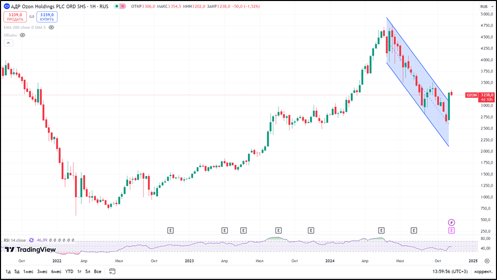 Озон – это иностранная компания, поэтому на Московской бирже торгуются не акции, а депозитарные расписки. С июня акции снизились на 30%. Но с начала года динамика позитивная +15%.