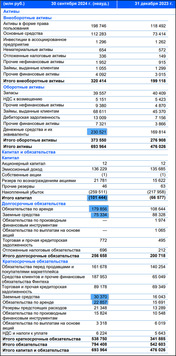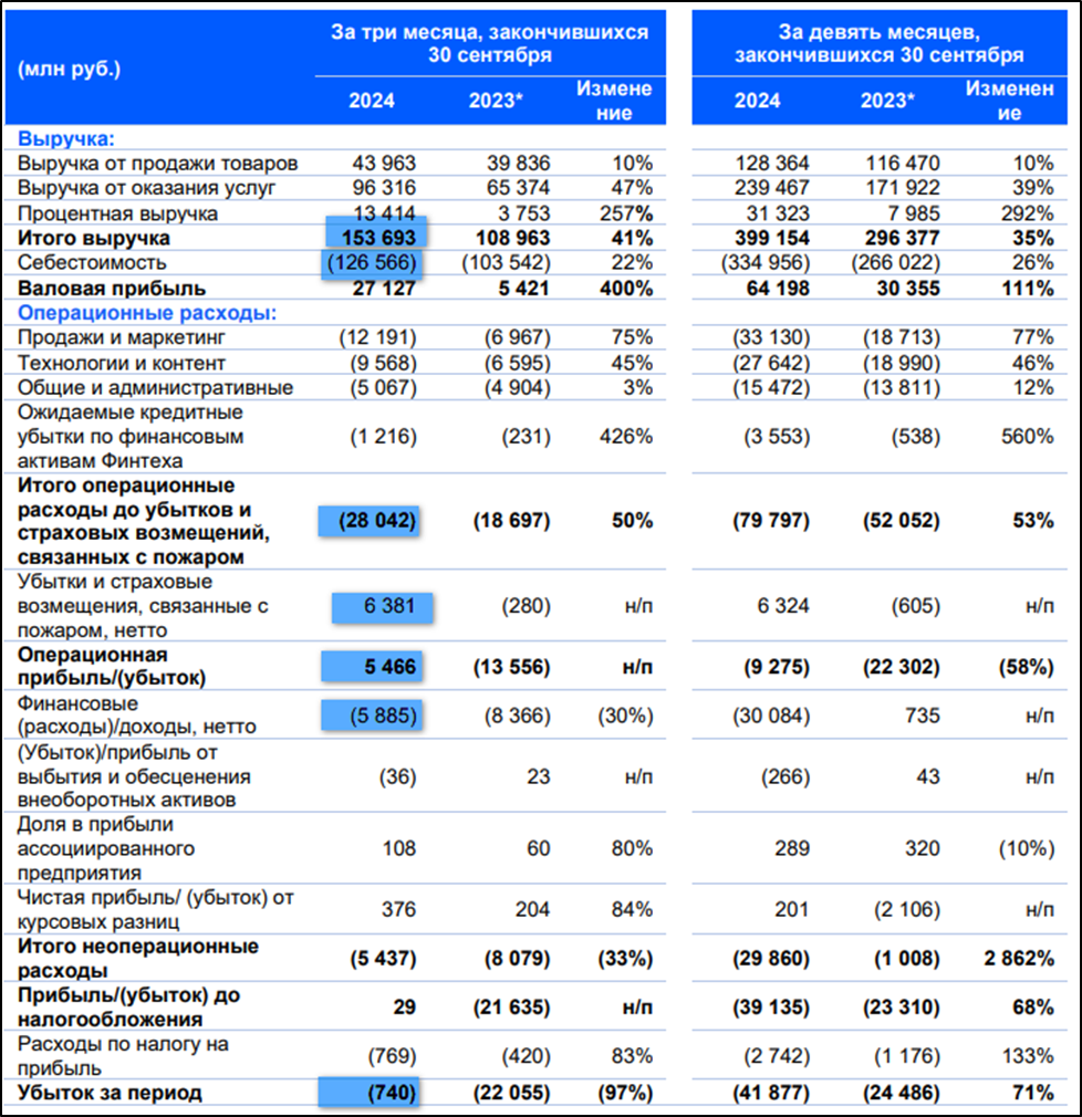 Операционные результаты быстрорастущие. Финансовые результаты 3Q 24 в части выручки и EBITDA рекордные. Большой позитивный вклад внёс Финтех. Но компания снова показала убыток, даже несмотря на страховые возмещения от пожара. FCF также рекордный. Финансовое положение нормальное.