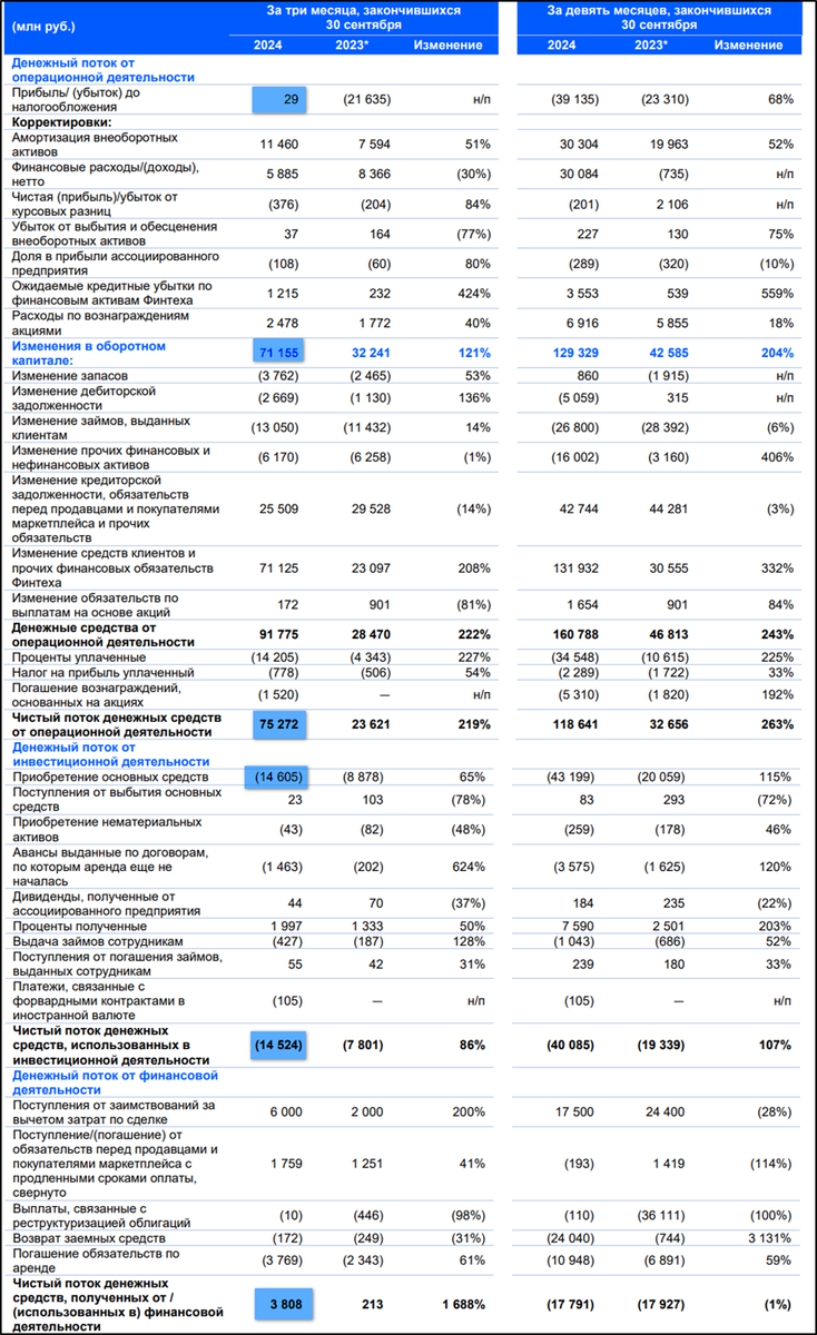 операционная деятельность +75 млрд (+3х г/г). Большой рост благодаря тому, что ЧП намного лучше г/г, а также из-за изменений в оборотном капитале, в основном из-за роста средств клиентов на счетах в Финтехе.