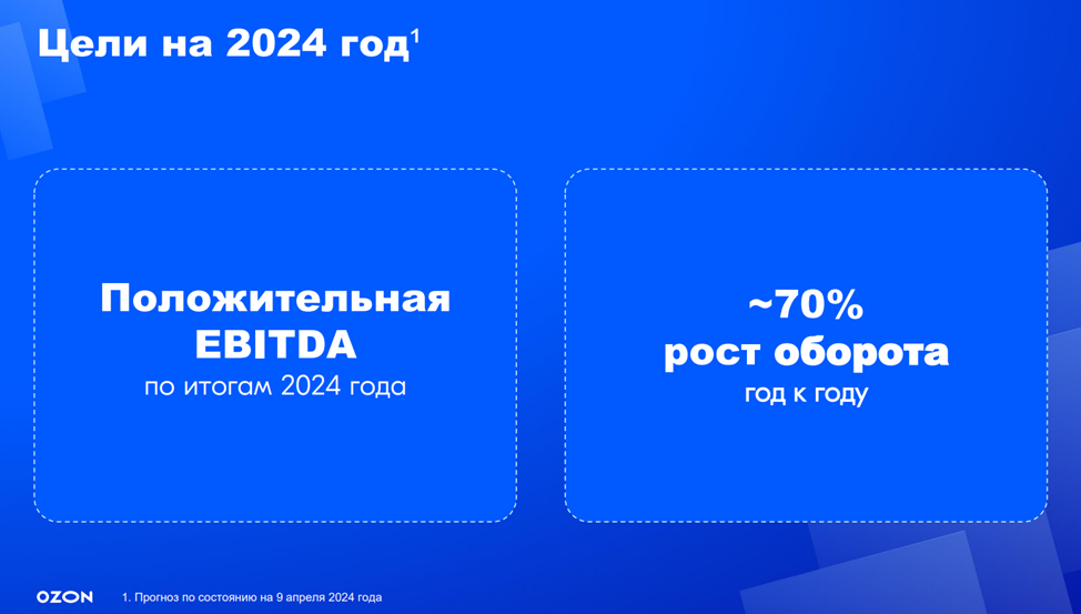 Озон немного понизил цели на 2024 год. Ожидается рост оборота на 60-70% г/г, а до этого планировали около 70%. Итоговая EBITDA должна быть положительной.