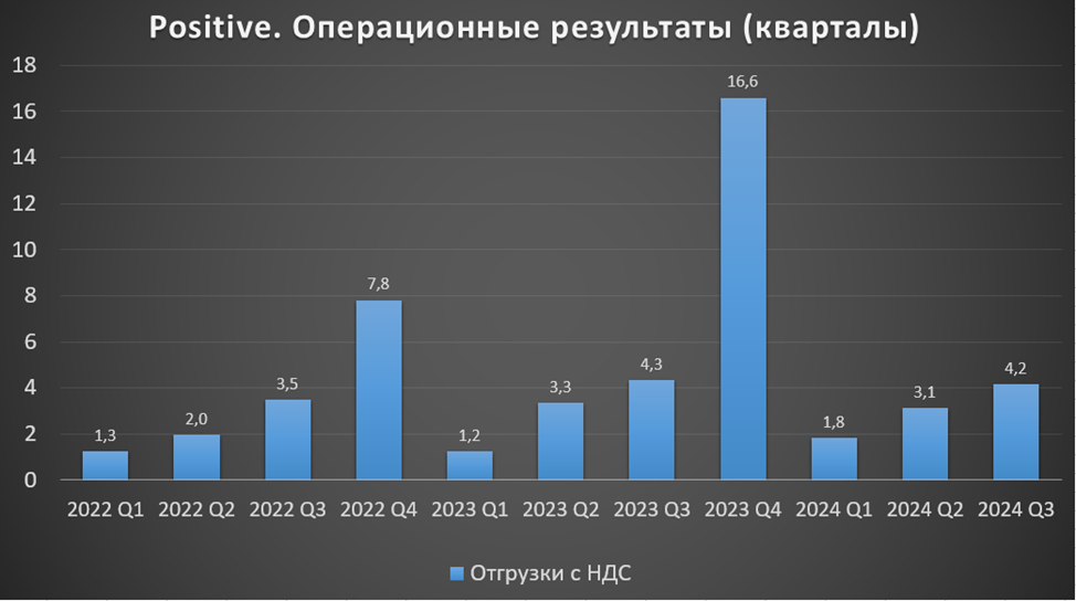 Отгрузки в 3Q 2024 составили 4,2 млрд (-4% г/г). Но из-за календарного цикла планирования и бюджетирования в РФ, компании присуща сезонность. 70-75% отгрузок приходится на 4 квартал.