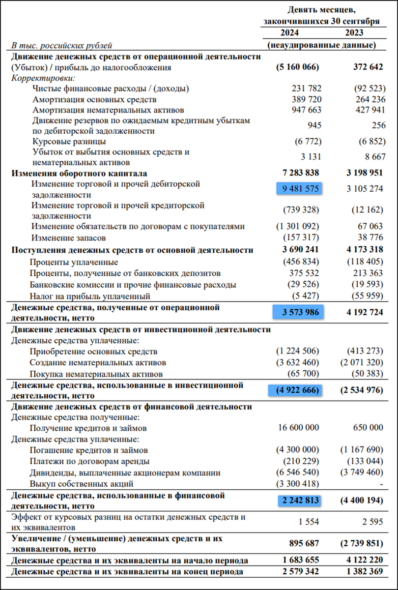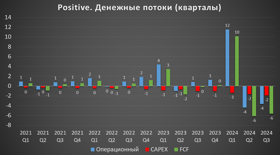 Традиционно, основные денежные средства поступают в первом квартале, там у компании сильный FCF. А в 2Q и 3Q2024 отрицательные операционные денежные потоки, плюс достаточно высокий капекс, в итоге FCF последние два квартала сильно отрицательный.