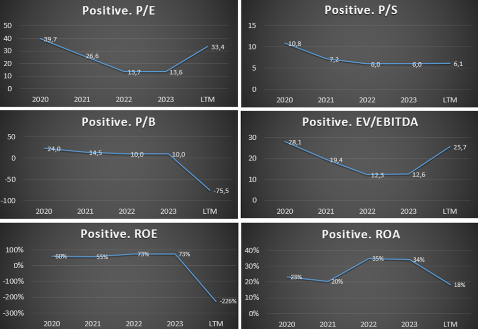 По мультипликаторам Позитив оценивается значительно дороже среднего уровня по сектору.