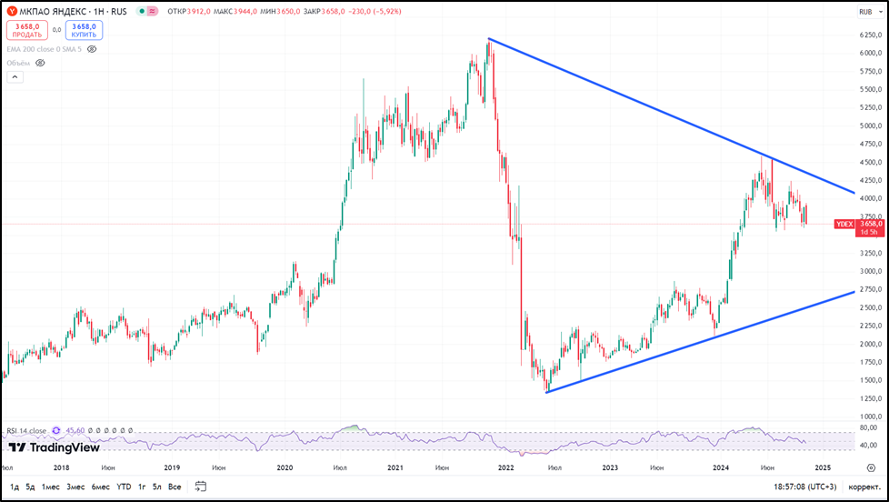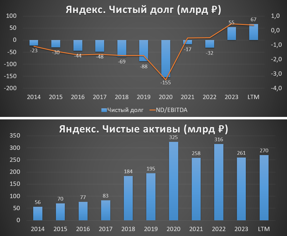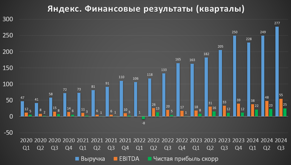 По прогнозам Яндекса: рост выручки по итогам 2024 года составит 40% г/г, а EBITDA 40-45%.