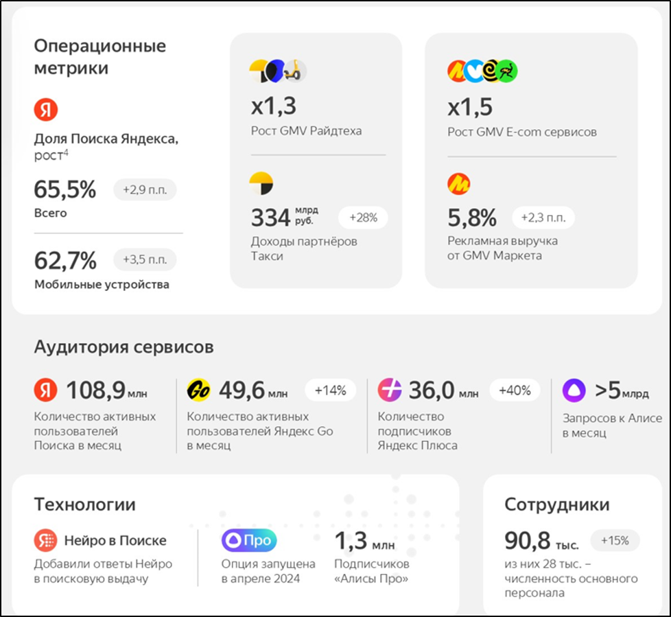 «Райдтех» включает сервис онлайн-заказа такси, каршеринг, а также сервис аренды самокатов. Аудитория «Яндекс GO» 49,6 млн человек (+14% г/г). Валовая стоимость заказов (GMV) в сервисах Райдтеха выросла в 1,3 раза г/г.