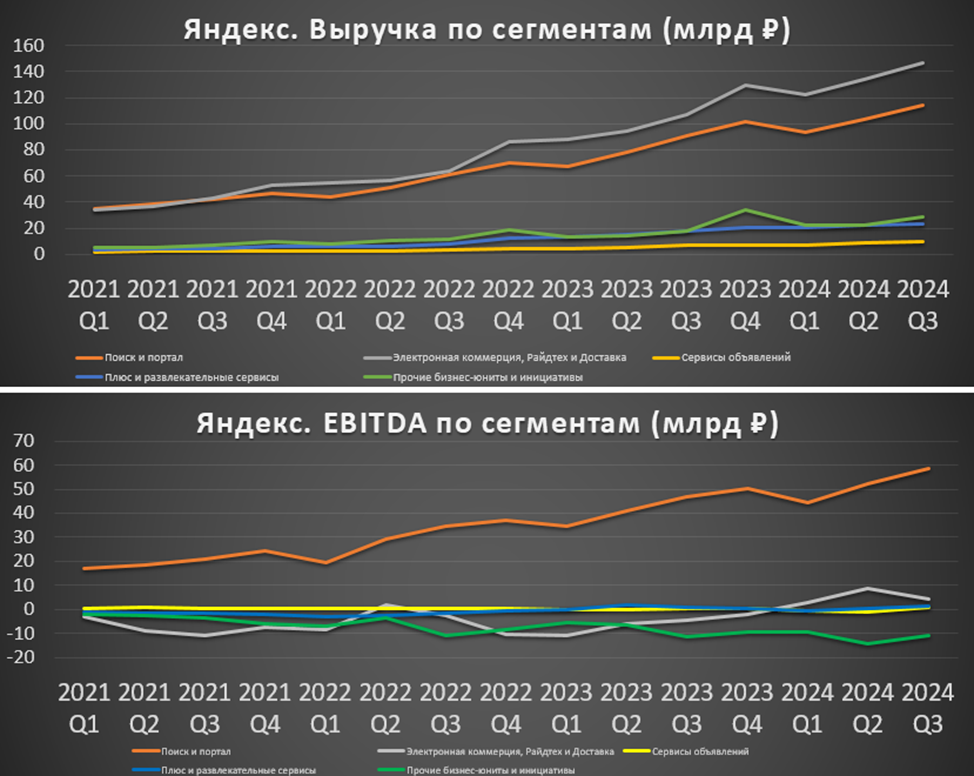 Основную EBITDA генерирует «Поиск и портал». Но важно отметить, что третий квартал подряд положительное значение у «E-com и Райдтех». Правда, это за счет райдтех, а E-commerce убыточен -14,7 млрд за квартал. Также большой убыточный сегмент: «Прочие бизнес-юниты и инициативы». Остальные сервисы в небольшом плюсе. Т.е. по сути, за счет «Поиска и портала» и «Райдтеха» финансируется развитие других направлений.