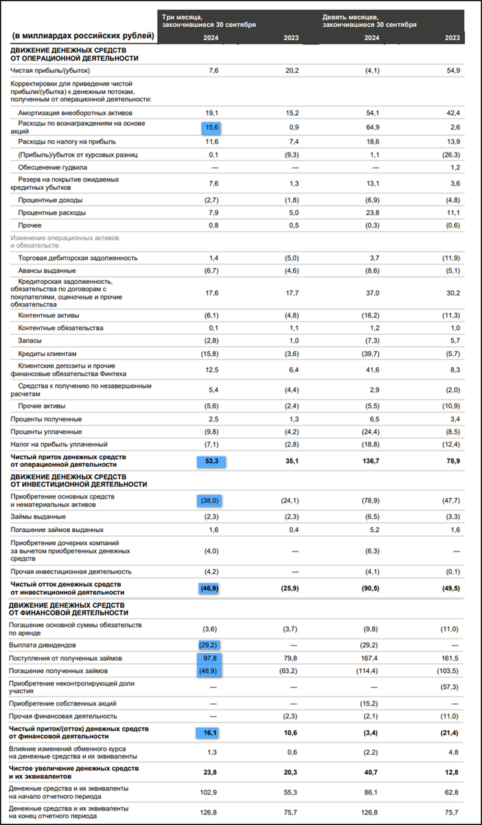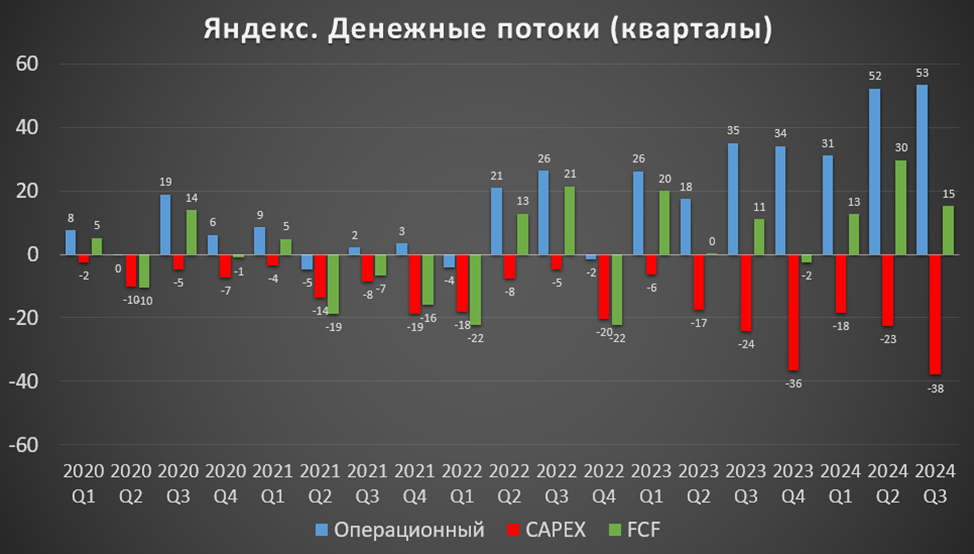 Операционный денежный поток, а также кап затраты в 3Q 2024 рекордные. FCF = 15 млрд – среднее для компании значение.