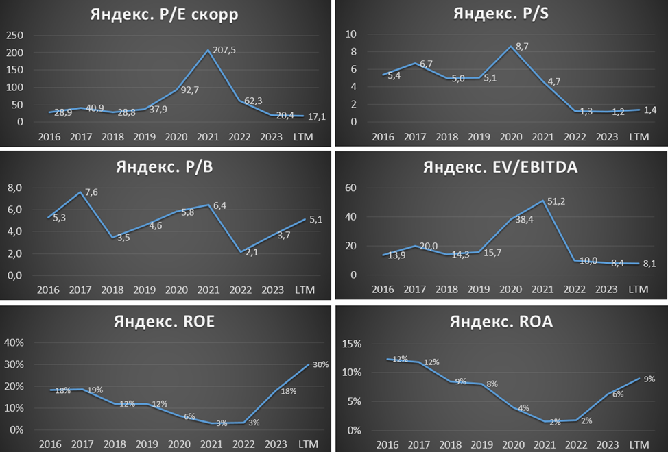 Мультипликаторы довольно высокие, но всё же меньше относительно своих исторических значений. Также нельзя забывать, что на данный момент у Яндекса много убыточных направлений, которые компания развивает. Например, если их убрать и оставить только Поиск, портал и Райдтех, то EV/EBITDA =3.