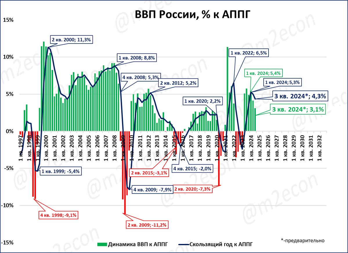 Росстат выдал предварительную оценку динамики ВВП в 3 квартале 2024 года: +3,1%.
