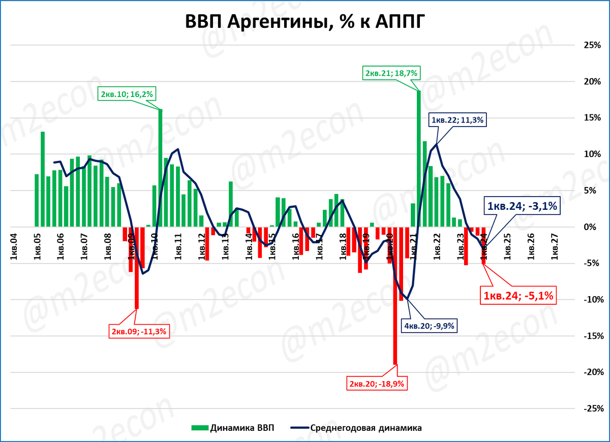 Падение ВВП в Аргентине в 1 квартале 2024 года составило -5,1%.