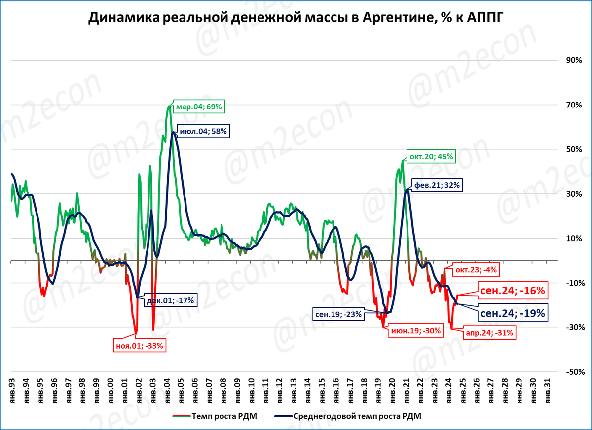 В Аргентине инфляция по итогам октября составила 193%. Одна из причин высокой инфляции – низкая (35%) ставка ЦБ Аргентины. Реальная денежная масса сжимается. ВВП Аргентины в 1 квартале 2024 года упал на 5,1%.