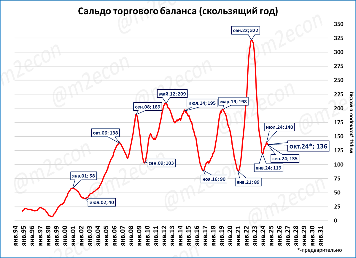Сальдо за 12 месяцев (скользящий год) составило 136 млрд. долларов.