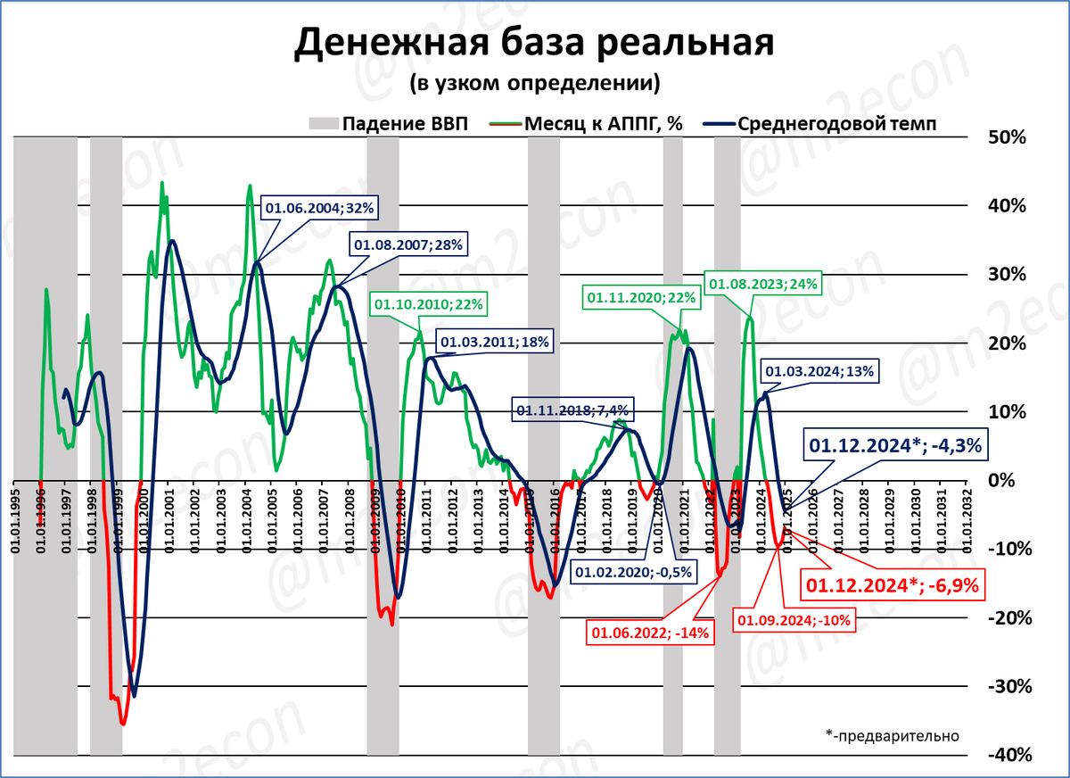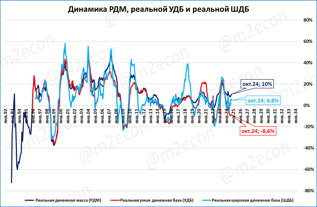 Узкая денежная база в реальном выражении падает, -6,9% годовых.
