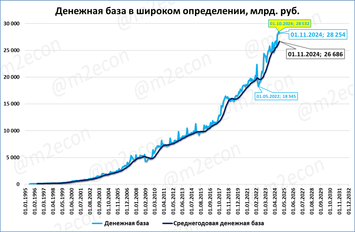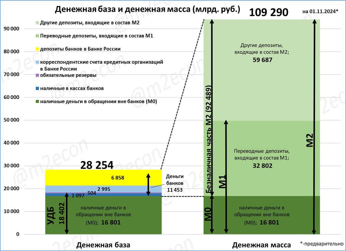 На 1 ноября по предварительной оценке ЦБ денежная масса составила 109,3 трлн рублей, а денежная база 28,3 трлн рублей.