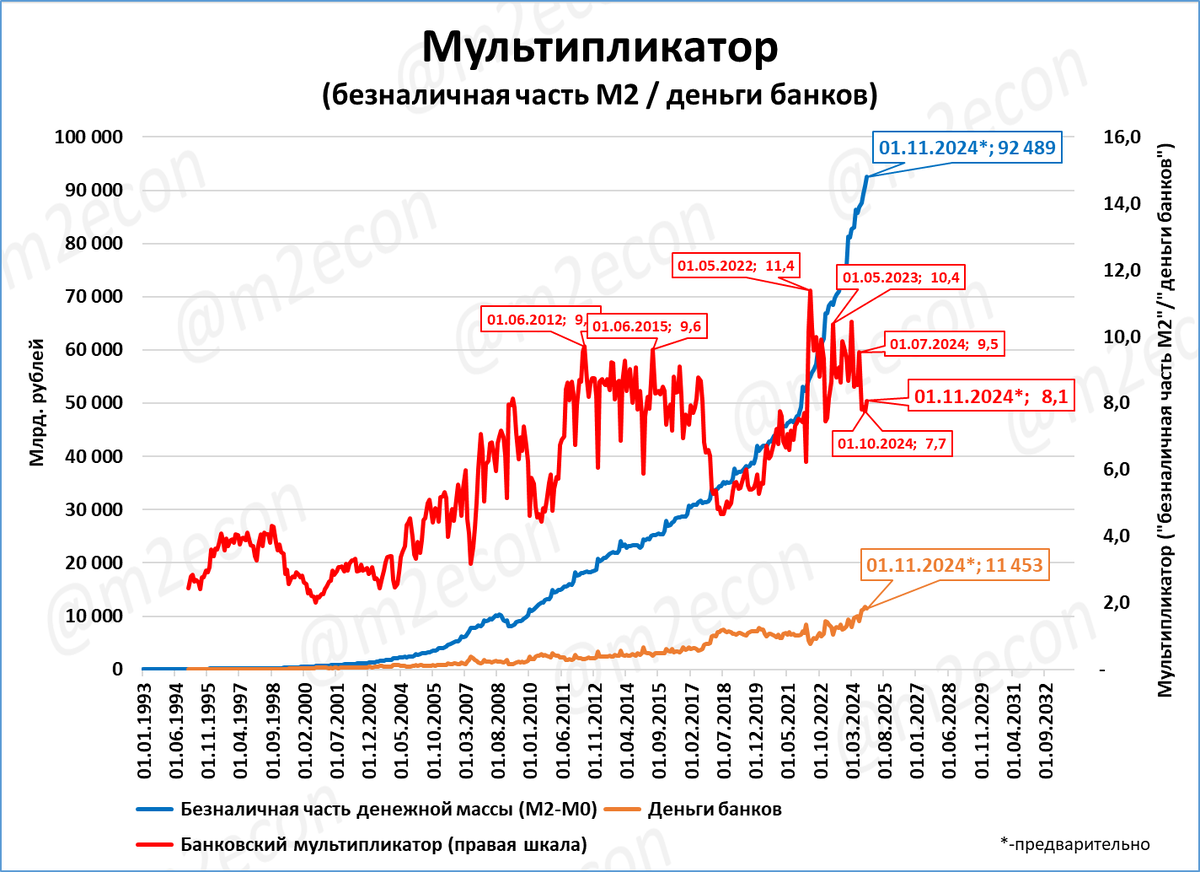 С другой стороны, такая ситуация ведёт к повышению рисков банковской системы из-за роста денежного мультипликатора. О текущем состоянии мультипликаторов см. инфографику далее.